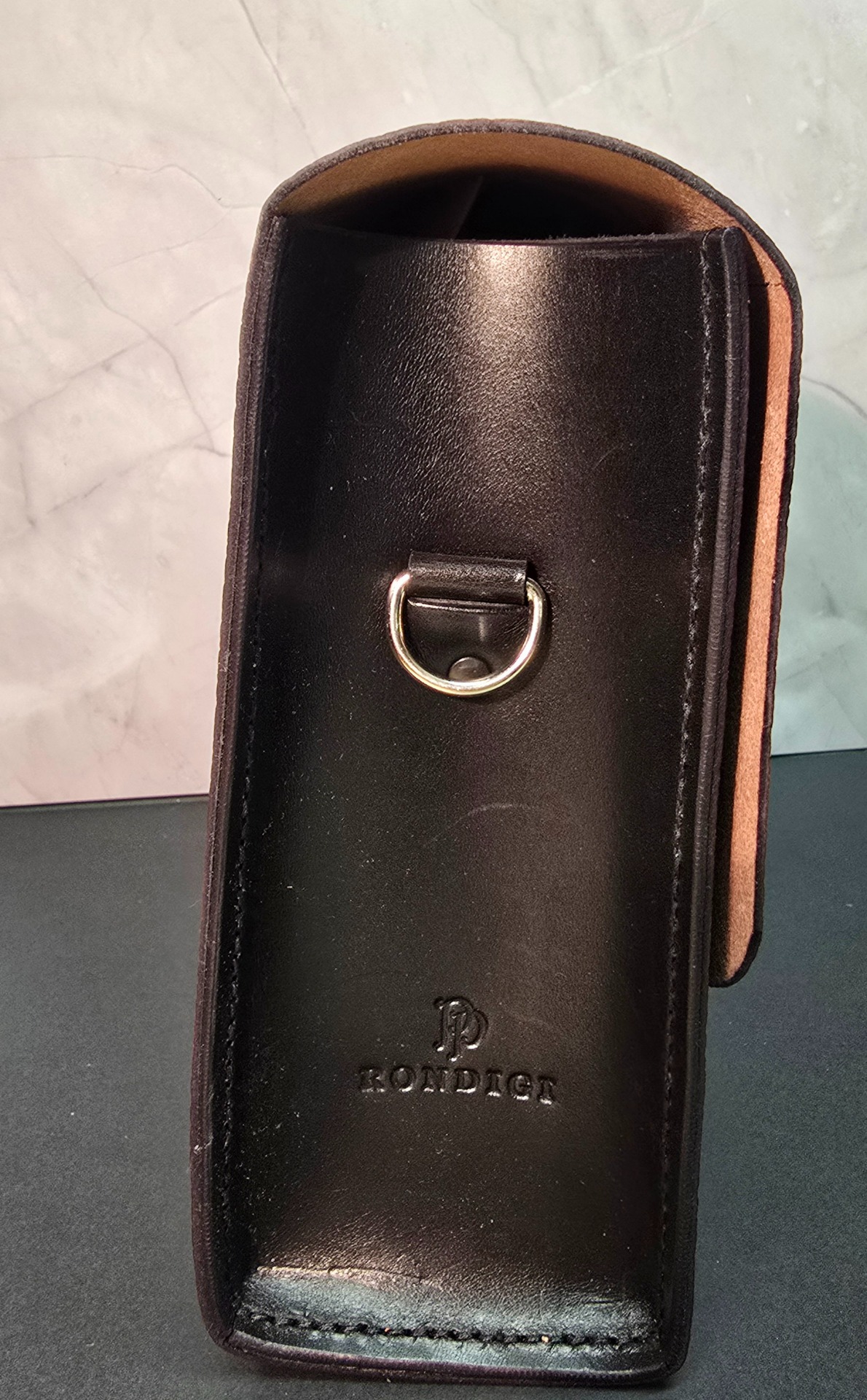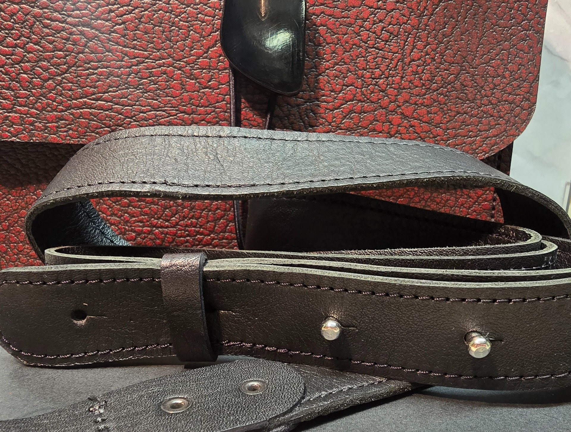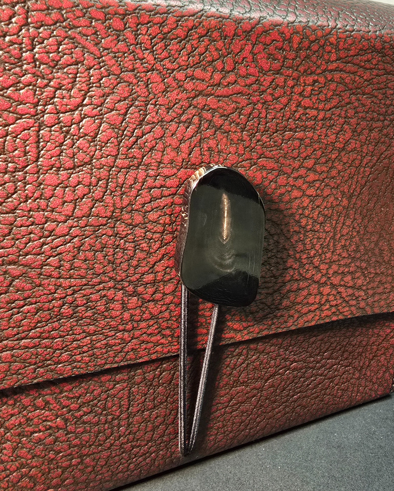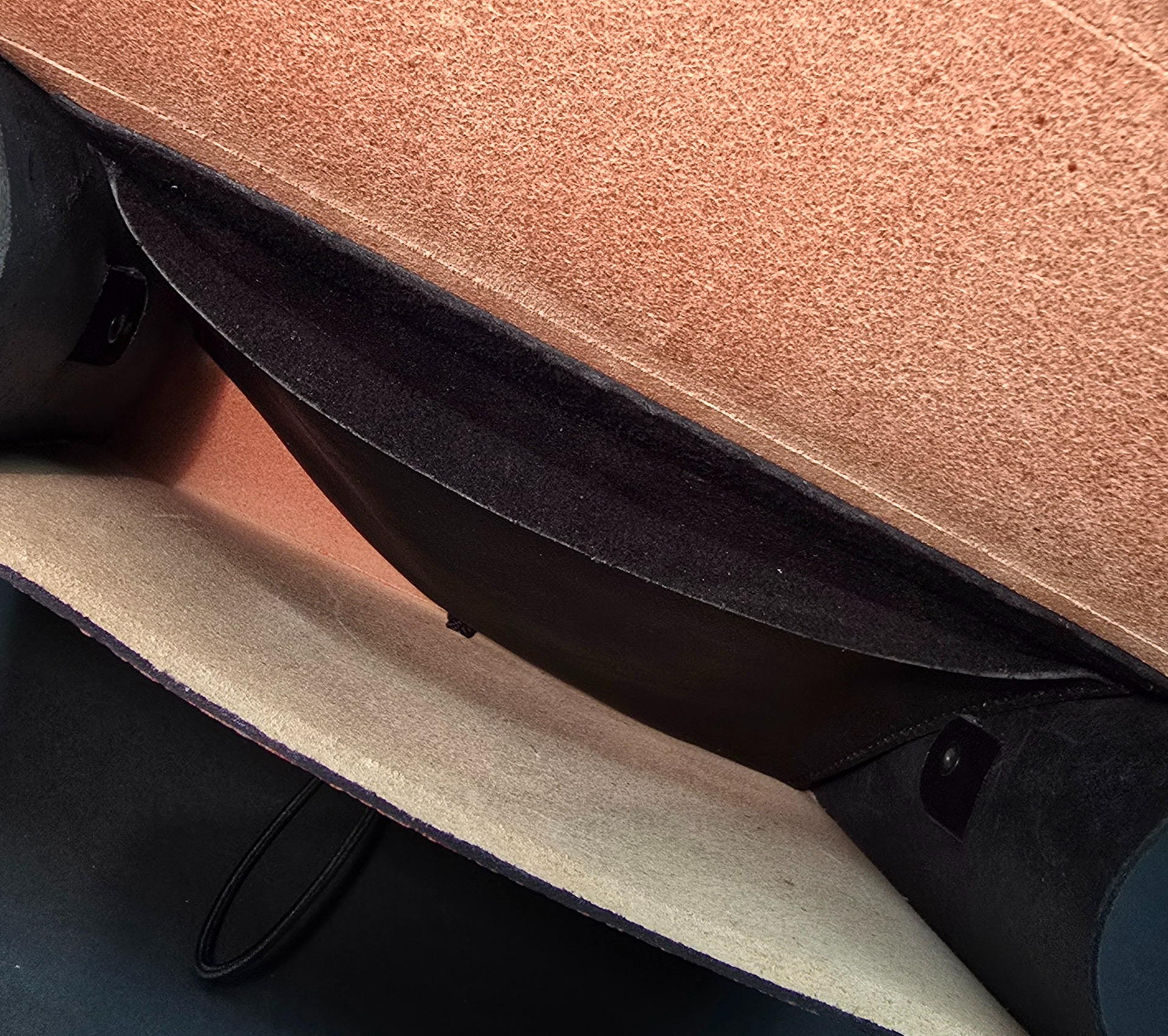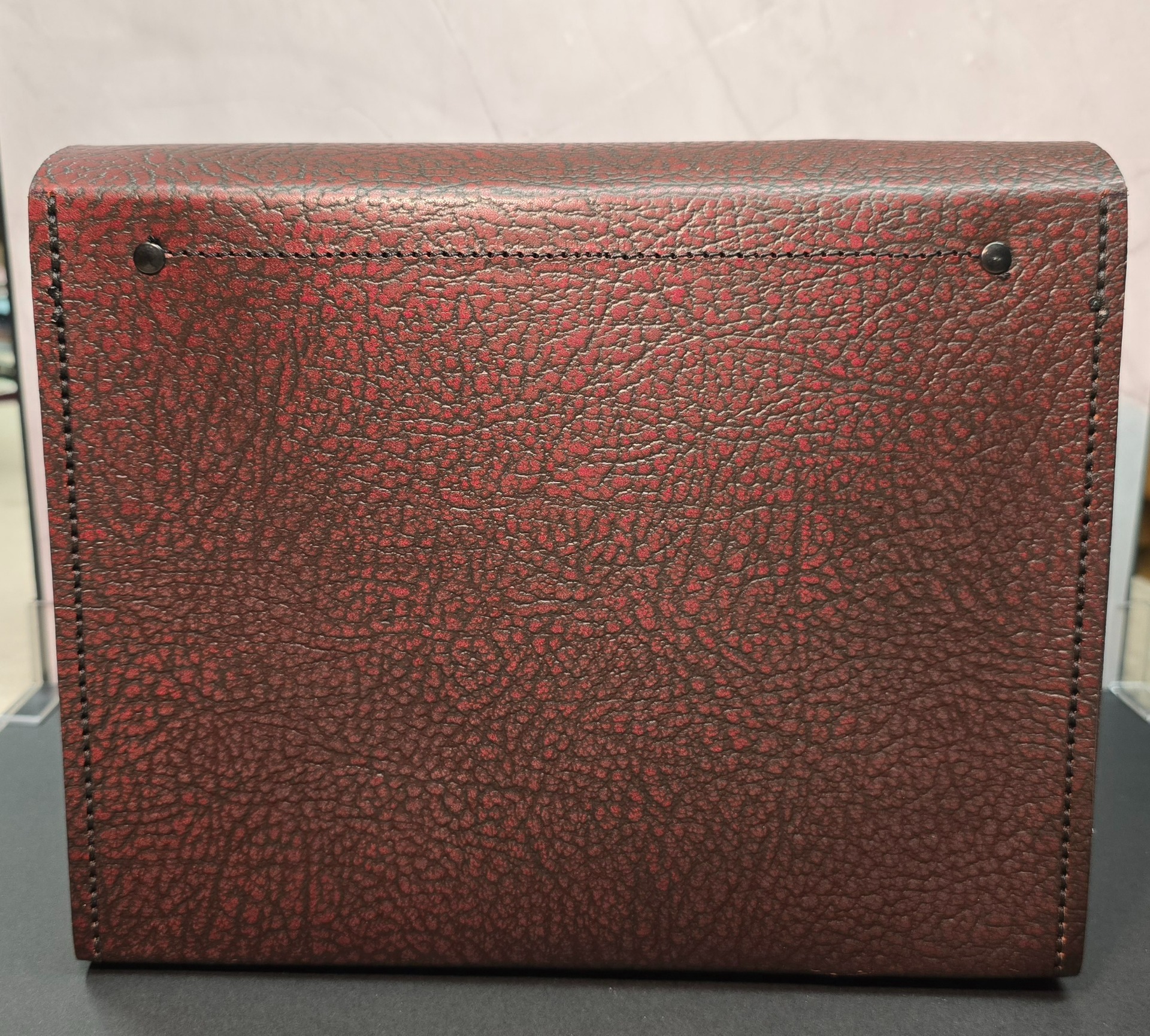 Handsydd väska i präglat läder med svarta gavlar skiftar i brunt och svart lite åt koppar hållet.